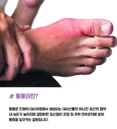 통풍은 혈액 속 요산 농도가 비정상적으로 올라가서, 결단체가 관절 내부에 적립되어 일어나는 만성적인 관절질환이예요. 주로 발가락, 발목, 무릎, 손목과 손가락 관절 등을 공격하며, 갑작스러운 난폭한 통증과 발열 등의 증상을 유발해요. 잘 맞은 치료가 이루어지지 않을 경우, 관절 손상 및 신장 결석 등의 합병증을 발생시킬 수 있어요.